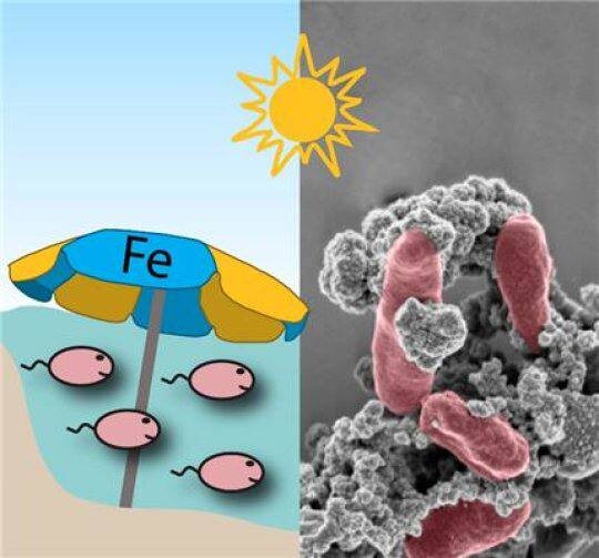 Статья, вдохновленная жарой под 40 градусов🫠 Современная атмосфера Земли содержит около 20% кислорода, благодаря которому существует озоновый слой — защита от опасного ультрафиолетового излучения 🏖️ Однако 3–4 миллиарда лет назад кислорода в атмосфере почти не было, и озонового щита не существовало. Поверхность планеты подвергалась интенсивному УФ-облучению. Тем не менее, именно тогда зародилась микробная жизнь… Возникает вопрос, как микробам удалось выжить?🤔 Ответ учёные нашли в поведении древних фотосинтезирующих бактерий. Эти организмы, жившие в мелководных участках океана, использовали солнечный свет и растворённое железо (Fe²⁺) для фотосинтеза. В отличие от растений, они не производили кислород. Вместо этого в результате их жизнедеятельности образовывались ржавчина и другие железосодержащие минералы. 🔗 Железосодержащие минералы обладают важным свойством: они поглощают ультрафиолет, но пропускают свет, необходимый для фотосинтеза. Таким образом, бактерии сами создавали вокруг с