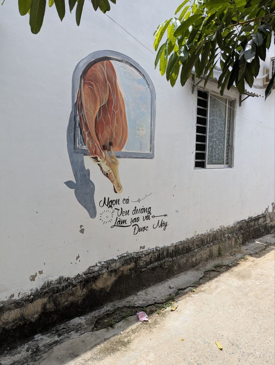 Деревня муралов. Нинь Туан. Вьетнам. 05.07.2025 На улице +37С, самое пекло. За воротами никого. Все прячутся в домах, где хоть немного, но прохладнее. Рисунки плюс-минус одного срока изготовления. Вообще, как почитала, по Вьетнаму это распространённая практика. Группа художников заходит в деревню (возможно ту, куда надо направить туристский поток), и наводит красоту на стенах домов и заборах.