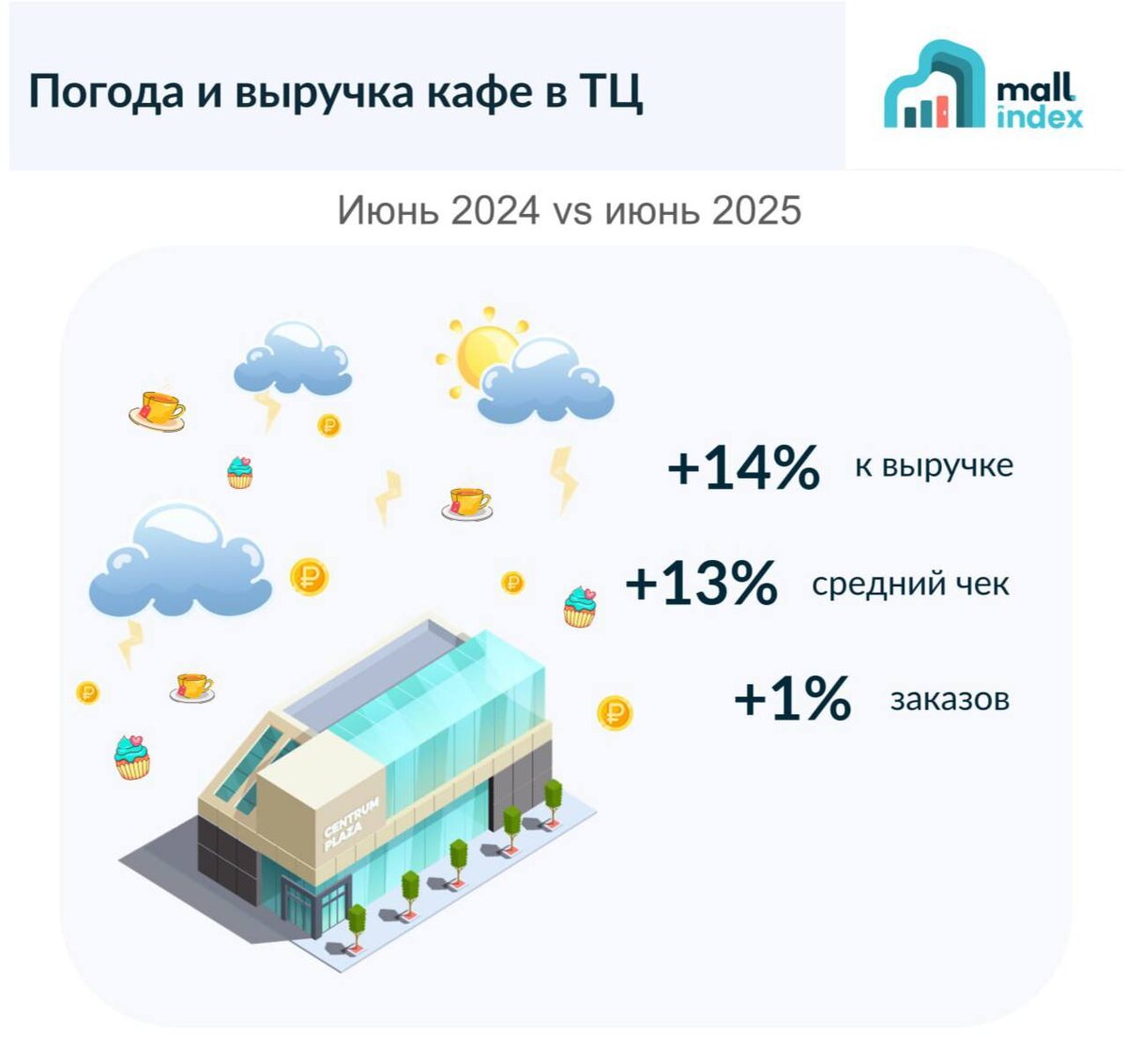 ☔️ Как июньская погода повлияла на выручку кафе в ТЦ Июнь 2025 года в Москве выдался холодным и дождливым — осадков выпало на 30% больше, а температура была ниже нормы на 1,5–2°C. Это резко увеличило трафик в заведениях внутри ТЦ, особенно в районных. 📈 Результат: +14% к выручке кафе и ресторанов в ТЦ, по сравнению с июнем 2024 Заказов стало больше на 1%, средний чек вырос на 13%. Особенно заметно выросли показатели у заведений в шаговой доступности — рядом с жилыми кварталами и рабочими зонами: +11% заказов, +12% средний чек, +24% выручка. ⛅️Погода — не единственный фактор. Москвичи всё чаще выбирают близкие маршруты и знакомые форматы — особенно в плохую погоду. Это поддерживает спрос на еду «рядом с домом» и обеденные спец предложения