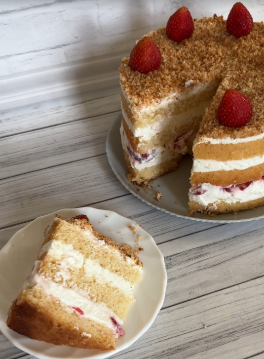 Нежный бисквит, воздушный сметанный крем и сочные ягоды. Что может быть вкуснее?! Я перепробовала много разных рецептов, но этот торт стал одним из самых любимых. И готовится довольно просто. Сейчас все подробно расскажу. Ингредиенты на большой торт 22-25 см. Бисквит: Крем: Начинка: Яйца с сахаром взбить до плотной светлой массы. Соединить муку с разрыхлителем. Просеять в яичную массу порционно, мешая лопаткой снизу вверх, чтобы тесто оставалось воздушным. Затем добавить масло и воду и еще раз аккуратно перемешать лопаткой. Вылить тесто в форму. Для бисквитов лучше всего подходит железное кольцо, дно которого закрывается фольгой. И бисквит хорошо поднимается и доставать его будет легко. Готовый бисквит остужаем в форме, достаем и заворачиваем в пищевую пленку. И отправляем в холодильник минимум на 8 часов. Так бисквит будет равномерно влажным и его будет легче ровно разрезать. Если нужно видео приготовления этого бисквита - то его можно посмотреть тут. Бисквит режем на 3 коржа. Неров
