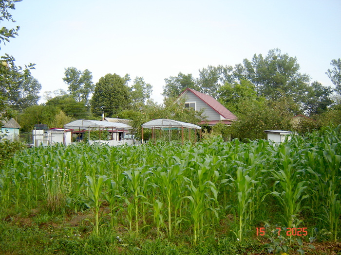 Вид с торца огорода на дом и навесы с грядками. На самом огороде сажаем тыкву, кабачки и кукурузу. Кукурузу сажаем рассадой, как и все остальное. Земля на огороде не обрабатывается уже шестой год. В здешних краях огороды пашут тракторами или мотоплугами. Мы же после сбора урожая запускаем кур и засыпаем землю опадом листвы, где куры роются и способствуют разложению листвы. По разному мы пробовали сажать кукурузу на огороде и посадки рассадой самый хороший способ, но здесь есть свои особенности. На грядке сладкая кукуруза и похоже уже почти готова. Капуста, рассаду которой мы купили на рынке, под названием "ранняя", похоже совсем не ранняя... Помидорный навес. Погода с начала июля под 40 град, но помидоры зреют, на удивление, буквально поштучно... Второй навес с огурцами, баклажанами и перцами. Огурцы растут отлично, и жена уже почти выполнила программу минимум по засолке огурцов на зиму.