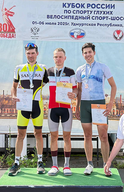 В Ижевске завершился Кубок России по велоспорту среди слабослышащих, собравший лучших гонщиков страны. Отлично выступил в столице Удмуртии курянин Алексей Божко, завоевав три медали. Как сообщили в областном мин-спорта, Алексей стал лучшим в критериуме, а также завоевал серебро в индивидуальной и групповой гонках. Первым курского велогонщика поздравил с наградами его тренер Евгений Ткачев. Игорь ЗИМИН Постоянный адрес статьи на сайте «Друг для друга» ~ https://dddkursk.ru/number/1603/sport/006777/. Архив статей газеты ~ № 28 (1603) 15 июля ~ 2025 год.