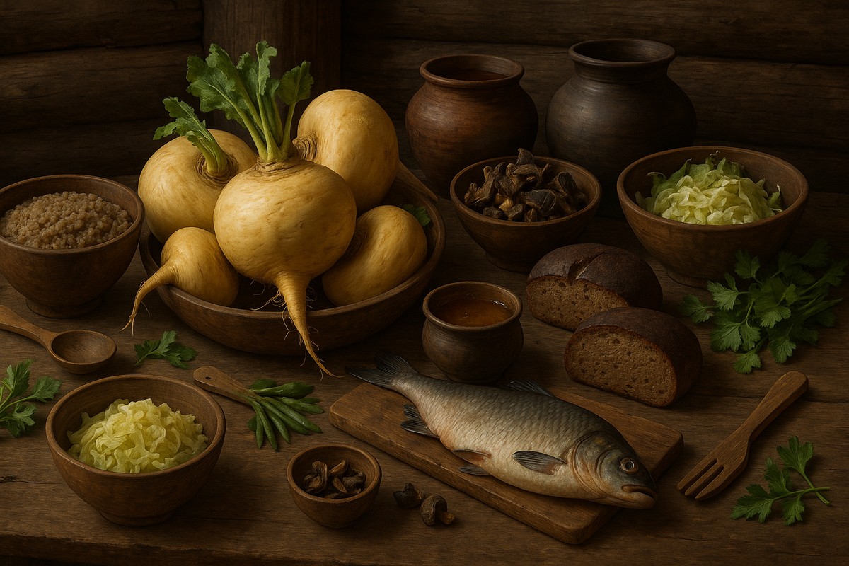 Представь себе — сидишь за столом богатого купца XVI века. Перед тобой расстилается пир на весь мир. Но нет ни картошки, ни помидоров, ни даже чая! Что же тогда делало обед по-настоящему роскошным? Вот загадка, которая меня зацепила. Мы привыкли думать, что без картошки — это голод и беднота. А оказывается, наши предки умели роскошествовать совсем без неё. Давай сначала разберёмся, как жили простые люди. Крестьянин просыпался — и первым делом хлеб. Чёрный, кислый, но сытный. Каша — гречневая, овсяная, пшённая. Это как база данных организма — простая, но надёжная. А овощи? Не морковка с картошкой, как мы думаем. Репа — вот царица крестьянского стола! Она и в супе, и печёная, и сырая. Брюква, капуста, лук. Грибы в лесу — бесплатная добавка к рациону. Но вот тут начинается самое интересное. Богатые ели совсем по-другому. Заходишь в дом зажиточного купца или боярина — и офигеваешь. Стол ломится от еды, но это не наша привычная роскошь. Мясо — да, но какое! Говядина, свинина, баранина. А