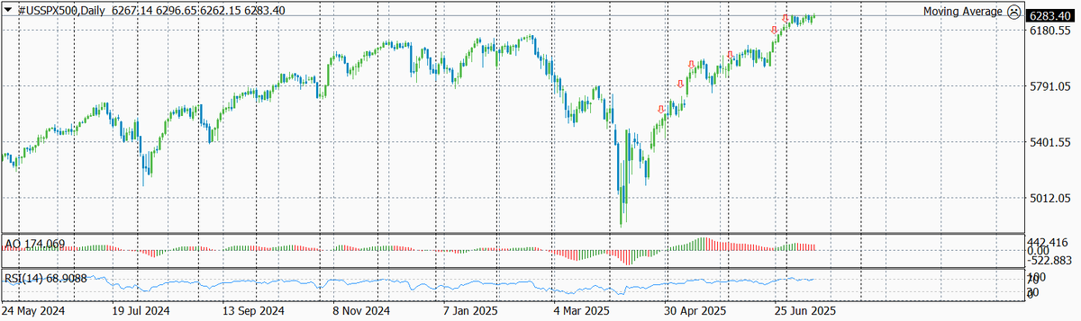 В дополнение к ранее открытым позициям, включая позиции 01.07.2025 Усиливаем шорт индексов акций S&P, Nasdaq и FTSE с пятым плечом от текущих уровней соответственно 6280, 23000 и 9000.