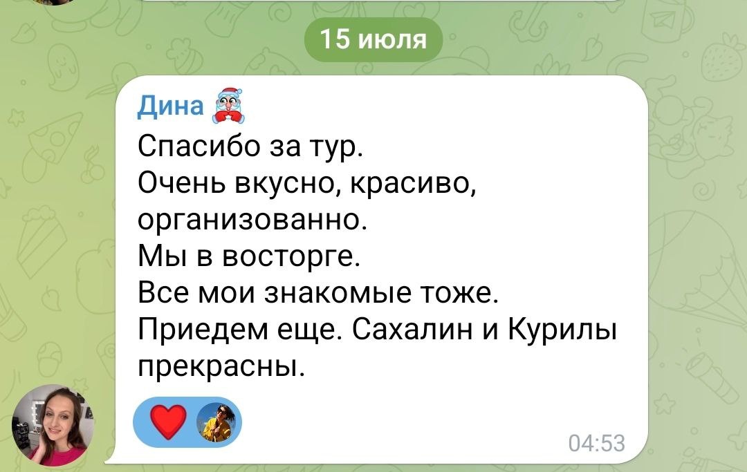У нас завершился первый тур на Сахалин и Итуруп. Группа разлетелась по домам, но пока живёт по -дальневосточному времени. Так рано утричком можно было читать приятные слова. Спасибо, друзья! И этим летом ещё можно увидеть остров Сахалин, поесть крабов на Охотском море, устриц на Буссе и классно- классно провести время. 2-10 августа Программа у меня 👇 @IrinaPolezhaeva #сахалин #итуруп #улетим_отзывы