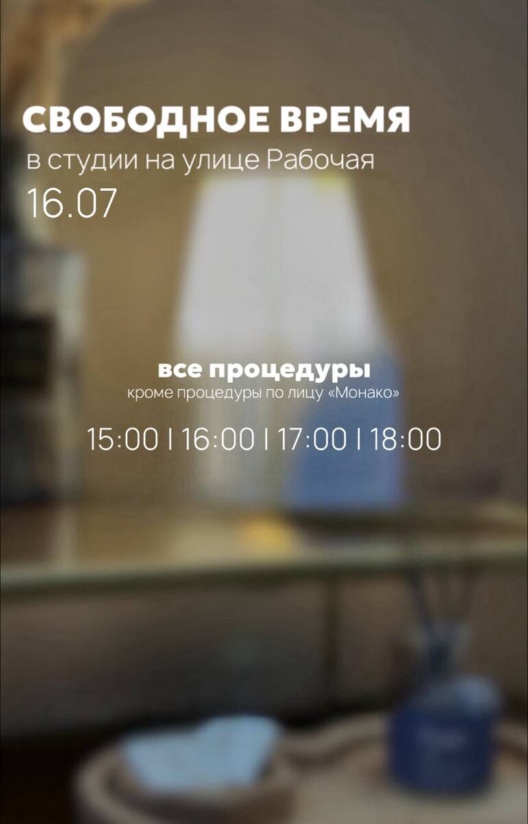 СВОБОДНОЕ ВРЕМЯ НА РАБОЧЕЙ 16.07 • ONLINE запись • WHATSAPP Ждём вас к нам на процедуры 🤍