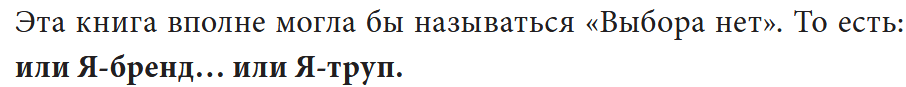 Самая важная и сильная идея этой главы — это вера в силу брендинга. Бренд — это вовсе не хитрость маркетологов или обман.А потребитель отнюдь не идиот. Дерьмо вы по большому счету брендировать не сможете. Бренд — это «товарно-доверительный знак».