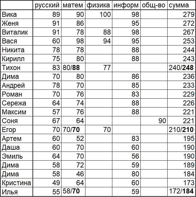 Я думал, что Виталик будет пересдавать - но он намылился в ВШЭ, а там его лишние баллы не помогут. Даже если бы пересдал на 90-92, то его 279-281 не прокатили бы. А на платное семья готова, как я понял. Ну и зря. В компьютерных делах главное не где ты учился, а где ты начал с третьего курса работать... А то и со второго. Я около 5 миллионов на учебу - на мой взгляд, неверно. Запросто мог бы написать ДВИ на ВМК МГУ и поступить. Но - у всех свои причуды. Я бы при прочих равных взял бы выпускника МГУ на работу. Пересдача была очевидно легче.