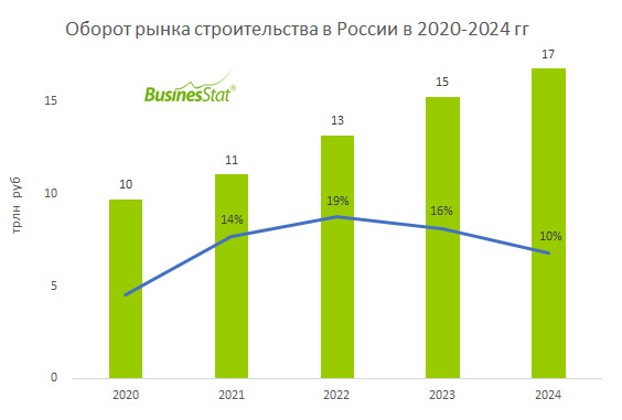 В 2020-2024 гг оборот рынка строительства в России увеличился на 73%: с 10 до 17 трлн руб.