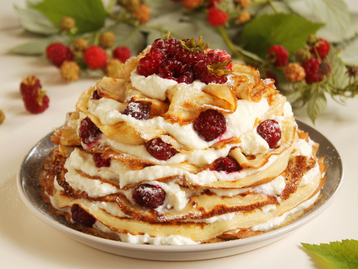 Нежное летнее лакомство: блинный торт с малиной, который хочется съесть весь до последнего кусочка