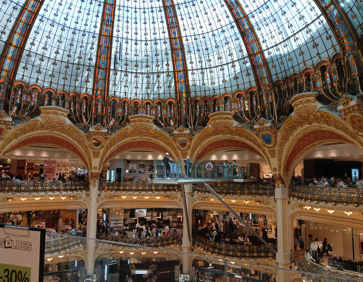 Раз уж гулять так гулять, это я про магазины. В понедельник я выложила фото из универмага Прентам, а сегодня расскажу что я увидела в Галери Лафает. Находятся они рядом, но в Лафает всегда многолюдно, всегда много туристов. Неудивительно, всем хочется увидеть такую красоту, купол этого универмага просто великолепен. 2 фото: У меня сложилось впечатление, что подбор товаров в этом магазине рассчитан больше на туристов, туристы приезжают отовсюду - и одежда с обувью есть на все вкусы. Ну а вначале кто куда, а я на лестницу. Она здесь довольно скромная, не то что в Прентам Но зато я обнаружила интересную выставку, История моды, как менялись образы модниц за 130 лет. Образы начала века 3 фото: И середина столетия. 3 фото: Ближе к современности. 3 фото: Так же интересно посмотреть на старые афиши -рекламу. 3 фото: И вот платья, уже повеселее чем в Прентам. Сидящие манекены все больше входят в моду. 3 фото Стиль Бохо шик он именно такой в этом году, не кричащий, сдержанно нежный. 4 фот