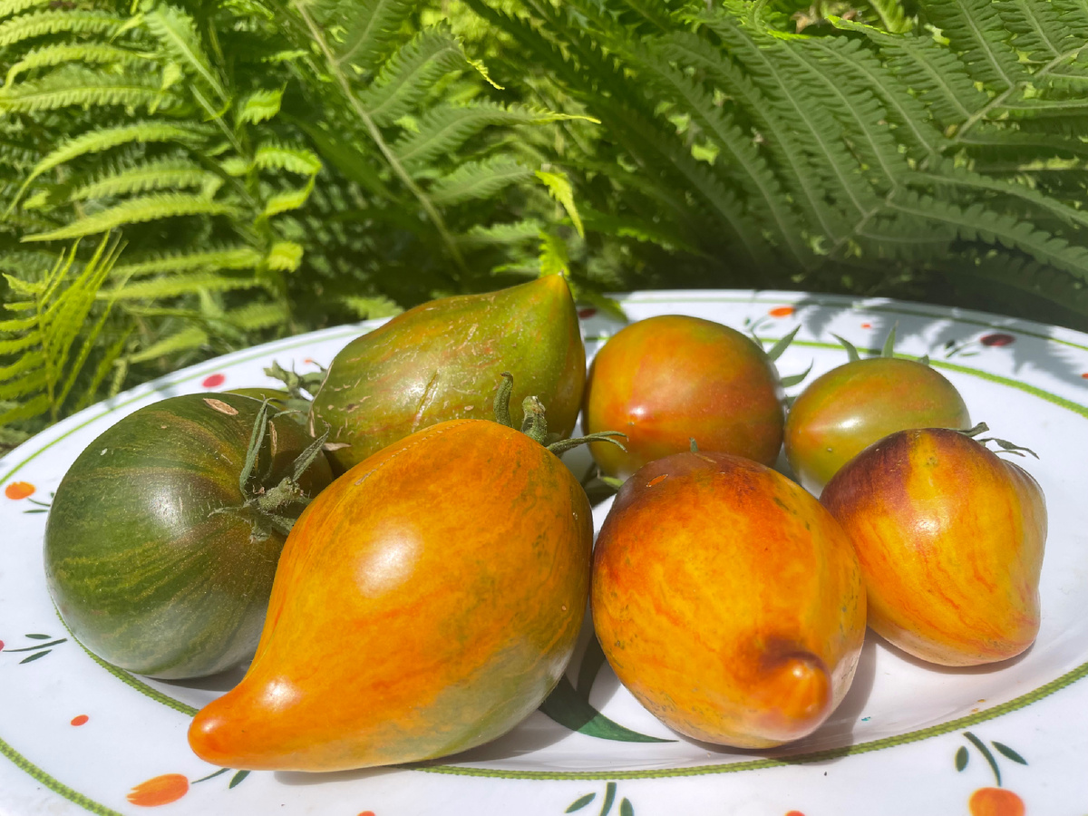 Приветствую читателей! За осень и зиму я купила 13 сортов селекции Софии Сааковой. И два добавила с прошлого года. Когда рассматривала картинки на упаковочках с семянами, радовалась, что помидорчики очень красивые. Мне даже не верилось, что такие бывают. Наконец то начинают созревать долгожданные плоды. 14 июля собрала с 5 разных кустиков вот такие помидоры. Два, которые меньше всех, это и есть Сладкое трюфельное сердце. О других тоже потом расскажу. Семена Экзотомат. Описание: Сорт - очередной шедевр вкуса и красоты из линии комет, селекционера Сааковой С. Индетерминантный, высокорослый (1,8-2 м), средиеспелый, суперурожанный. Плоды биколорные сердечки правильной формы и формы трюфеля, оливково-зелено-малинового окраса, на некоторых плодах проскакивает антоциан на плечиках, средний вес 250 -300г, очень вкусные, сладкие, сочные с маслянистой тающей мякотью. Сорт урожайный, болезнеустойчивый, с длительным плодоношением, назначение салатное. Очень сладкий и красивый томат! Сорт