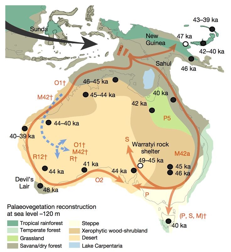 Точное время заселения Австралии остается предметом споров среди учёных. Достоверно установлено, что люди находились там 43 000 лет назад. С большой вероятностью — 45 000 лет назад. Менее достоверны, но возможны даты в 48-49 тысяч лет.