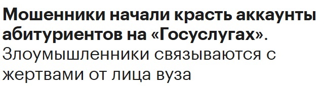 С 13-15 июля, почти все интернет издания грубо говоря перепечатали тему в стиле «Мошенники обманывают абитуриентов, поступающие в опасности, крадут аккаунты с Госуслуг». Объединяет эти истории, упоминание абитуриентов, что понятно, сейчас пора поступлений и подачи документов. Далее уже разброс того что нужно мошенникам: - получить доступ к аккаунтам в Госуслугах; - вынудить перевести деньги на безопасный счет; - представиться сотрудником Вуза, куда поступает абитуриент и выманить деньги за 100% поступление. Последнее упоминает такое издание как ТАСС https://tass.ru/obschestvo/24502933 К сожалению, примеров, или хотя бы истории потерпевших я не нашел. В самой статье указано что обман идет через социальные сети и мессенджеры. Но как идет этот обман? Всем, у кого соцсети приходит сообщение «хотите поступить в ВУЗ, платите сюда»? Могу допустить, если человек подписан в группу «готовимся поступить в университет», то получает такое предложение, но в ВК за пару левых ссылок банят аккаунт, мно