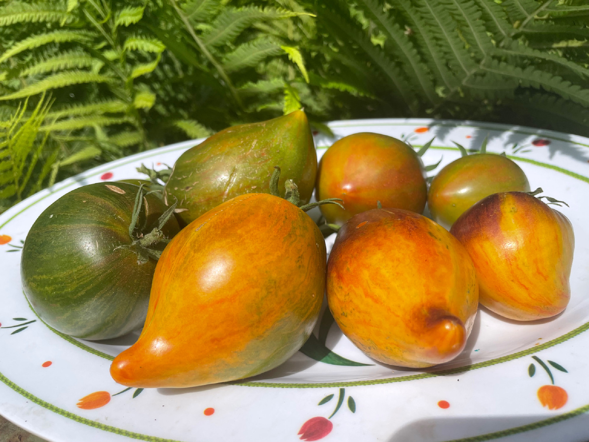 Продолжаю рассказывать о том какие помидорчики у меня выросли на томатах селекции Софии Сааковой. Первыми созрели 5 сортов. Эту тарелочку с помидорами уже показывала. На ней Сладкая карамель Софии, Сладкое трюфельное сердце, Салют Виктории, Волшебная радуга и Искушение. Эта статья про Искушение. Семена Экзотомат Описание с упаковочки: Solanum lycopersicum L. Сорт — шедевр красоты, выведен Сааковой С. Индетерминантный, высокорослый (1,8-2 м), среднеспелый, супер урожайный. Плоды сердцевидно-удлиненные биколоры с вытянутым носиком, яркого пестрого окраса с небольшим лиловым антоцианом на плечиках, средний вес от 150 до 350 г, очень вкусные, супер сладкие сочные с маслянисто-мармеладной тающей биколорной мякотью. Сорт очень урожайный, болезнеустойчивый. Самый сладкий и красивый томат. Сорт молодой, возможны расщепления! Очень заманчивое описание. И название отличное. Как такой не купить? Тем более я люблю помидоры с носиком. А по описанию он еще и очень урожайный, болезнеустойчивы