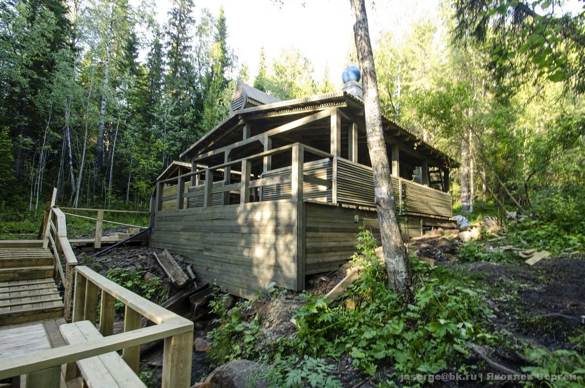 Вот так сейчас выглядит часовня Иконы Божией Матери Тихвинская в урочище Куртяево. Так выглядела "старая" часовня 1992 года. Новая часовня получила большие по размеру "гульбища". Они стали менее "воздушные", а сама часовня стала коренастой и неуклюжей, потеряв свою лесную сказочность. Новая часовня лишилась центральной двери, теперь там икона Богоматери, а внутри два образа: Алексий Человек Божий и Собор Архангельских Святых. Иконы не традиционные "на досках" , а напечатанные на картоне или пластике. Старая часовня переместилась почему-то в болото.