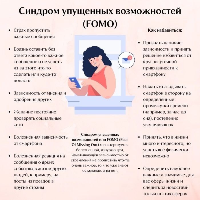 FOMO: когда страх упустить выгоду гонит по соцсетям и вредит психике Привет! Сегодня поговорим о FOMO (Fear Of Missing Out) – синдроме упущенной выгоды. Это тревожное чувство, что где-то происходит что-то лучшее, важное или интересное, а вы этого не видите и не участвуете. Почему соцсети – ГЛАВНЫЙ виновник FOMO? 1. Идеализированная картинка: Ленты соцсетей – это череда "лучших моментов": вечеринки, путешествия, успехи. Мы видим глянцевую версию жизни других, забывая, что это лишь фрагмент, а не вся правда. 2. Бесконечный поток: Новые посты, сторис, обновления льются непрерывно. Успеть за всем невозможно, но мозг кричит: "Проверь! А вдруг что-то важное?" 3. "Все там, а я нет": Фотографии встреч, мероприятий, тусовок, куда вас не пригласили (или вы не смогли пойти), прямо указывают: "Ты пропускаешь". 4. Круглосуточная доступность: Соцсети всегда под рукой. Возникает навязчивое желание постоянно проверять ленту, чтобы "быть в курсе". Как FOMO бьет по психическому здоровью? * Хрон