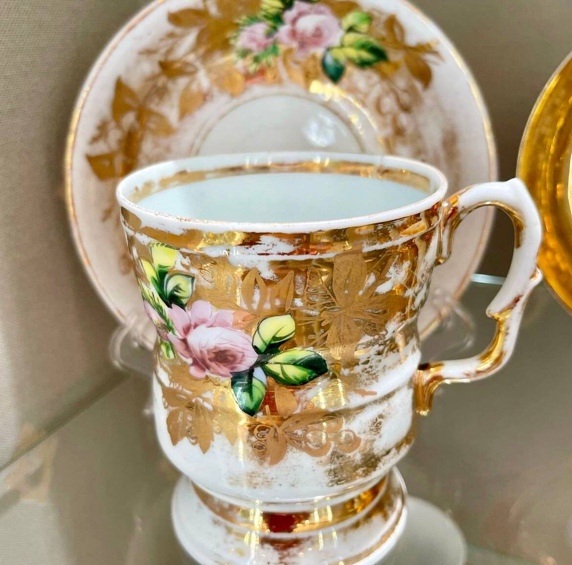 Наиболее трудоемкая и дорогая роспись на «фасонных» чашках; полунутро - когда чашка покрывалась золотом на внутренней поверхности до половины и расписывалась цветочным декором выполнялась опытными специалистами.