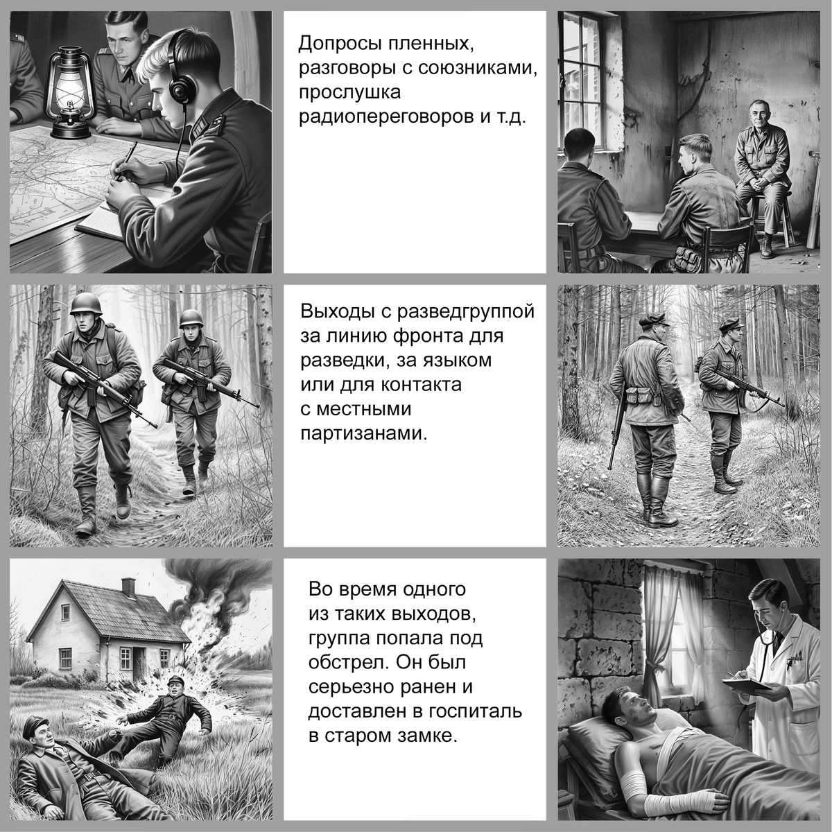Сначала Шувалов находился при штабах разного уровня в качестве переводчика. Набравшись военного опыта, начал выходить с группами разведчиков за линию фронта для разведки или за языком, или для контакта с местными партизанами. Все эпизоды по этой ссылке. Сердце продолжало работать, но невозможно было предсказать, как поведет себя этот осколок дальше. Выбор у Шувалова был небольшой: 1) Холить и лелеять этот капризный кусочек металла, чтобы он лежал на месте и не натворил бед. Для этого Лёне самому надо было лежать на спине на ровной поверхности, глядя в потолок, и ждать прогресса медицины. 2) Учиться жить нормальной жизнью с некоторыми несущественными, как ему казалось, ограничениями и с осознанием того, что в любой момент его сердце может перестать работать. Шувалов выбрал второе. Раны заживали и он начал предпринимать небольшие неспешные прогулки по замку. Однажды Шувалова попросили поучаствовать (в качестве переводчика) в разговоре с владельцем здания, в котором располагался госпитал