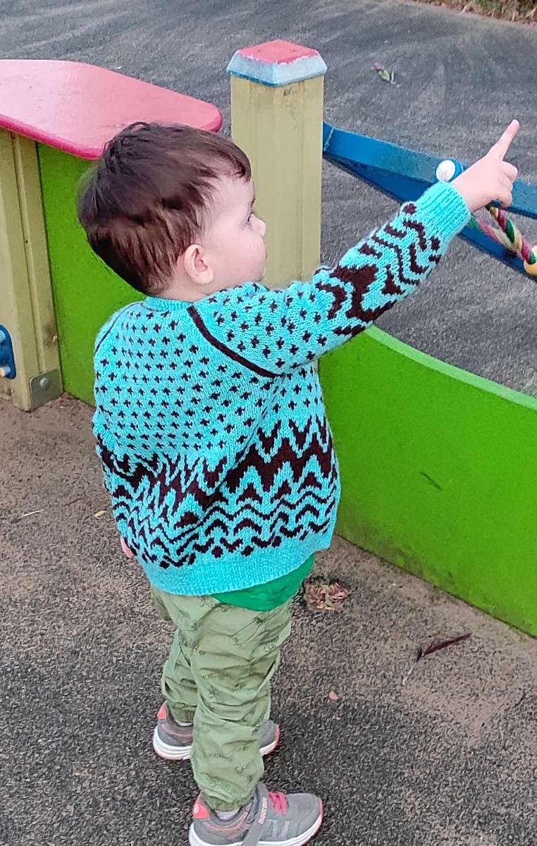 Эту кофточку я связала три года назад для своего сына. Тогда она казалась мне просто удачной — тёплая, мягкая, с хорошим простым рисунком. А теперь, когда в неё нарядилась моя младшая дочка, я понимаю: эта кофта — не просто вещь. Это находка. Во-первых, она двусторонняя. С жаккардом в обе стороны. Я сначала искала молнию на две стороны, чтобы можно было носить и изнанкой. Но так и не нашла ничего подходящего. Потом я долго думала, какую сторону сделать «лицевой» — в итоге выбрала голубую. Потому что смотрится свежо, особенно с коричневым узором. Недавно прочитала в одной статье, что голубой и коричневый не сочетаются»… Хммм... А мне — нравится именно это сочетание. Этот голубой мне напоминает отпускное небо, а коричневый делает его ещё ярче. Бирюза — вообще мой любимый полудрагоценный камень и мой любимый цвет, а там и голубой, и коричневые вкрапления. Эта кофта действительно мной тщательно продумана. Манжеты сидят отлично, так как прилегают к запястью, а не модно телепаютс