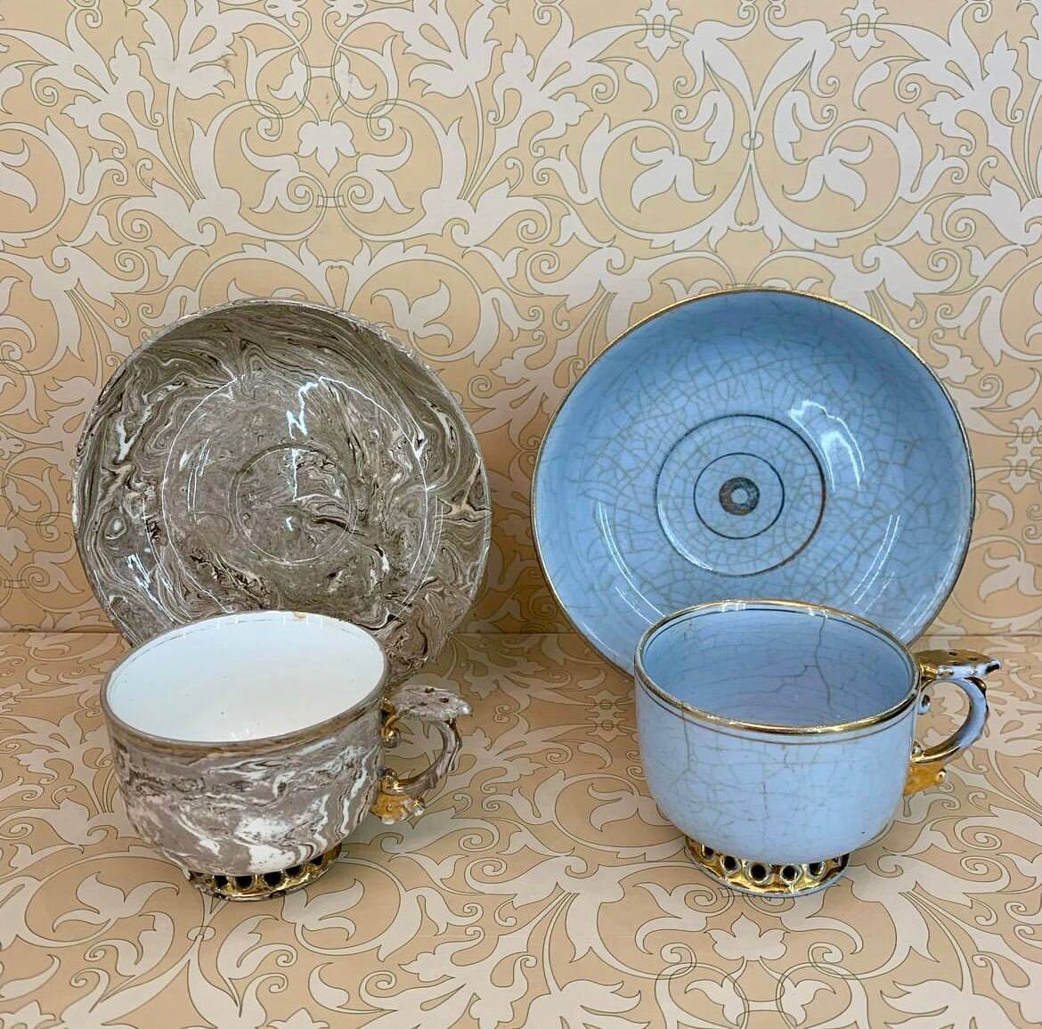 Добрый день! Сегодня фарфоровый день. Смотрим предметы из серии обманок. Такими предметами славен завод Федяшина, который был основан в деревне Жирово Бронницкого уезда Московской губернии в 1866 году. Обманки бывают разными. На столе часто могут стоять предметы сервировки, которые своим внешним видом совсем не соответствуют содержанию и функционалу. Перед нами сегодня чайные пары, которые предназначены именно для чаепития. Обман во внешнем виде. Обе пары похожи на изделия из камня, а не из фаянса. На мой взгляд, это самый безобидный способ обмана. Да ещё и необычный. На заводе Федяшина таких предметов было изготовлено немало. Кроме предметов в стиле «тромплей» ассортимент завода состоял из столовой и чайной посуды, изразцов, чернильных приборов и кукольной посуды. В начале своей деятельности завод выпускал только фаянс, потом и фаянс, и фарфор. В последние годы выпускался опак и глиняная посуда: горшки, кружки и кринки. Это посуда называлась «колерок» - изделия с темно-красным черепко
