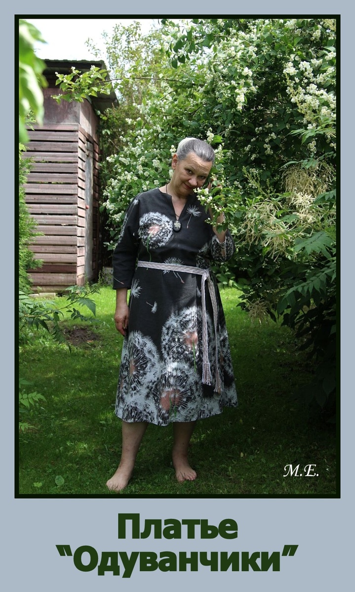 Это платье – проверка выкройки, которую я нашла в бесплатном доступе в интернете. Я построила её уже давно, но никак не могла собраться сшить по ней хоть что-то, чтобы проверить. Как часто у меня бывает, всё решилось само собой. Я обратила внимание на лежащую у меня ооочень давно ткань и… увидела платье. Умом я понимала, что этот материал для пошива постельного белья, но уже не могла отделаться от образа платья из него. И ведь даже оправдание для себя нашла: ткань лежит у меня давно, уж и не помню, сколько она стоила. Значит, считай, бесплатно можно платье сделать. И тут же к этому прибавилось: «Мне же нужно выкройку проверить!..» Я редко долго обдумываю свои рукоделочки. В ту же ночь (это ж самое творческое время!!!) я раскроила платье. При этом разложила выкройку так, чтобы крупные одуваны лежали несимметрично наверху, но совпадали внизу. Для этого пришлось сделать впереди и сзади шов. Но эти швы в готовом изделии почти незаметны. Сшила я платье тоже быстро. В выкройке почти не пришл