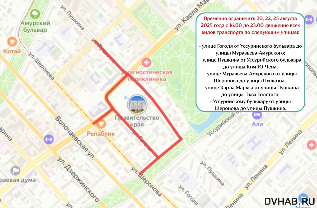 - улице Гоголя от Уссурийского бульвара до улицы Муравьева-Амурского;- улице Пушкина от Уссурийского бульвара до улицы Ким-Ю-Чена;- улице Муравьева-Амурского от улицы Шеронова до улицы Пушкина; - улице Карла Маркса от улицы Пушкина до улицы Льва Толстого;- Уссурийскому бульвару от улицы Шеронова до улицы Пушкина.