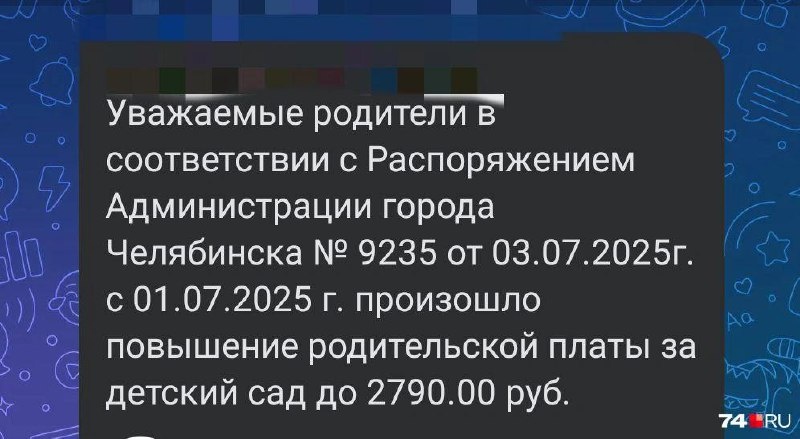 «25% задним числом» В Челябинске с 1 июля подняли плату за детские сады. По словам читателей, расценки подняли сразу на 25% и сообщили об этом постфактум, не предупредив заранее. 🟥 Мнение родителей. Наш подписчик, чей ребенок ходит в детсад № 455 на Северо-Западе, получил уведомление об изменении оплаты на этой неделе. Он признает, что это, конечно, не повод уйти совсем, но осадок неприятный. «Как потуги с повышением рождаемости сходятся с повышением платы за детский сад на 25% задним числом (было 2220, стало 2790). Крайне неприятно с учетом того, чем кормят ребенка, он ест через раз. Получается, просто выкинуть еще больше денег», — возмущается читатель @74.ru. 🗯 А что говорят в мэрии? Повышение в администрации объяснили тем, что плата не менялась три года, а цены на продукты и обслуживание детей растут ежегодно. 💳 Теперь стоимость в месяц такая: • 3060 рублей — за круглосуточное пребывание, было 2440; • 2790 рублей — за полный день (12 часов), было 2220; • 1380 рублей — за гру
