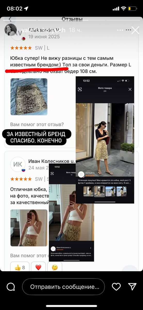 Еще одно воровство у маленького российского бренда. Основательница Novembre Лера Образцова обнаружила свою юбку на Алиэкпресс. Продавец использовал для карточки товара фото оригинальной юбки и клиенток бренда из соцсетей. Среди отзывов на товар тоже были ворованные фотографии клиенток Novembre.