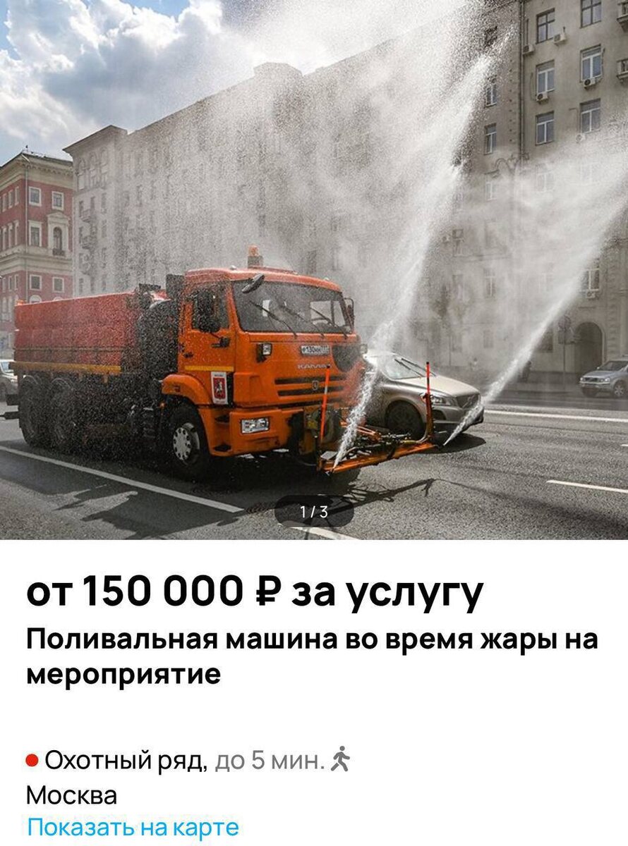 Лол, в Москве можно арендовать настоящую ПОЛИВАЛЬНУЮ машину — за ₽150 тысяч она приедет на любое мероприятие и устроит освежающий душ.