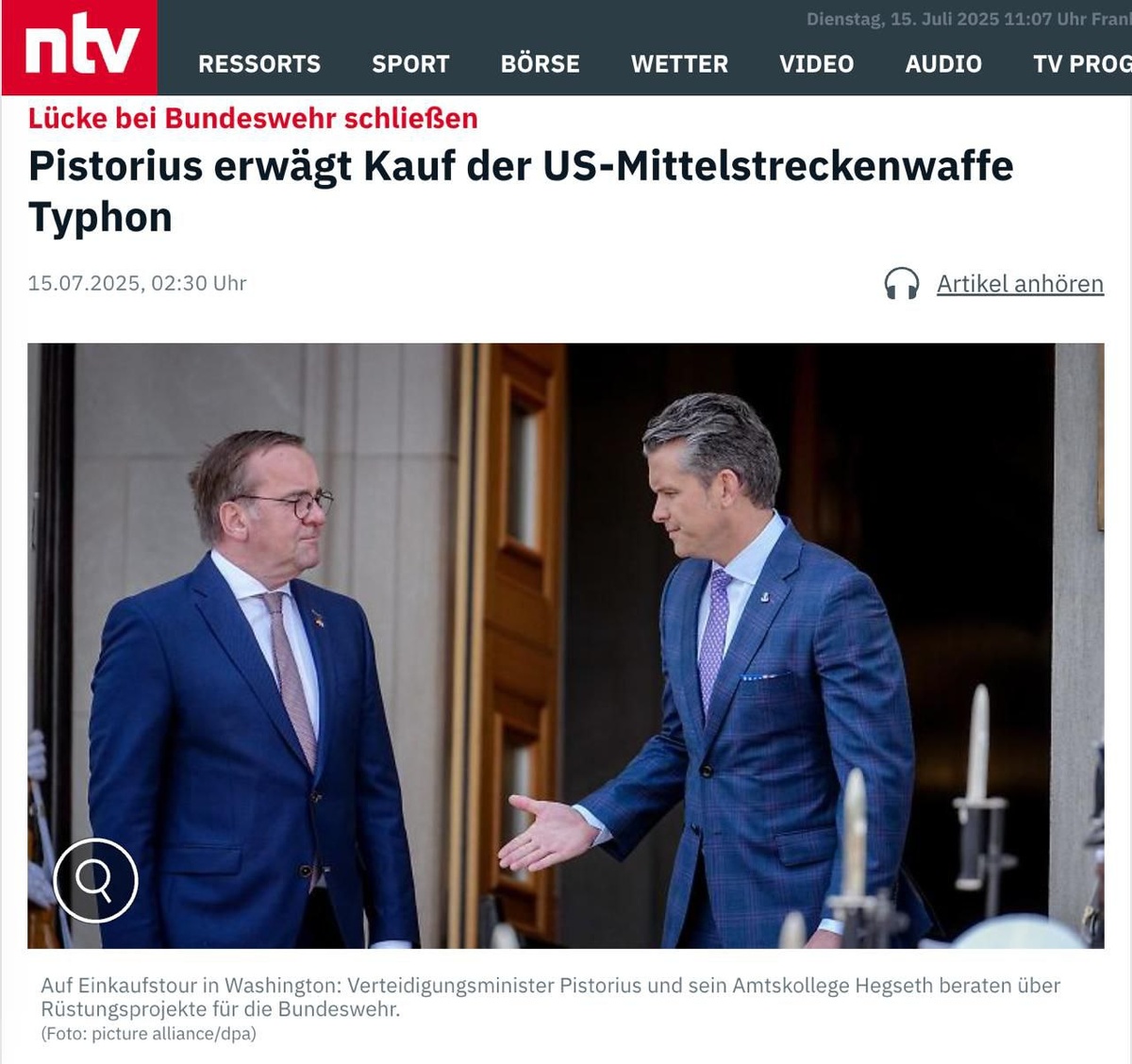 Германия обсуждает покупку у США пусковых установок Typhon, предназначенных для запуска ракет Tomahawk, способных поражать цели на расстоянии 2000 километров - то есть и в России. Об этом сообщил министр обороны Германии Писториус, который обсудил в США эту идею с главой Пентагона Хегсетом, передает ntv. Хегсет не против. «Таким образом, Германия может значительно повысить свою собственную обороноспособность, а также значительно повысить свою способность сдерживания, но и способность сдерживания Европы», — сказал Писториус. Германия явно хочет взять реванш за проигранную Вторую мировую войну