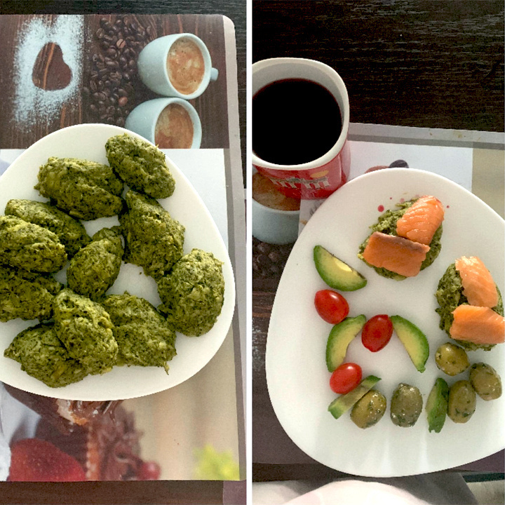 Завтрак! Долго думала, чем заменить хлеб? Сделала лепёшки из брокколи. Для лепёшек из брокколи: ✔ Брокколи (свежая или замороженная) – 300 г; ✔ Лук репчатый – 1 шт. (100 г); ✔ Псиллиум (молотый) – 2 ст. л. (10 г); ✔ Специи: соль – ½ ч. л., чёрный перец – ¼ ч. л., чеснок сушёный – ½ ч. л., паприка – ½ ч. л. (по желанию). ✔ Масло растительное – 1 ч. л. (для смазывания мультиварки). Способ приготовления: Брокколи припустила 10 минут на пару, порубила мелко ножом. Добавила луковицу, которую в пюре в блендере перемолола, 2 столовые ложки псиллиума и специи. Всё перемешала, и поместила в мультиварку на «Пар». Получилось очень неплохо! КБЖУ лепёшек (на 100 г) – 45/3,2/0,5/7,1 (из них клетчатка – 4,0). На лепёшки положила кусочки слабосоленой сёмги, получились забавные «бутерброды». Добавила помидорки черри, нарезанный авокадо (несколько кусочков), и несколько оливок. И чай облепиховый. Рецепт на странице Автор рецепта – Слава Фридкина Расчёт КБЖУ сделан с помощью Telegram-чат-бота https://t.m