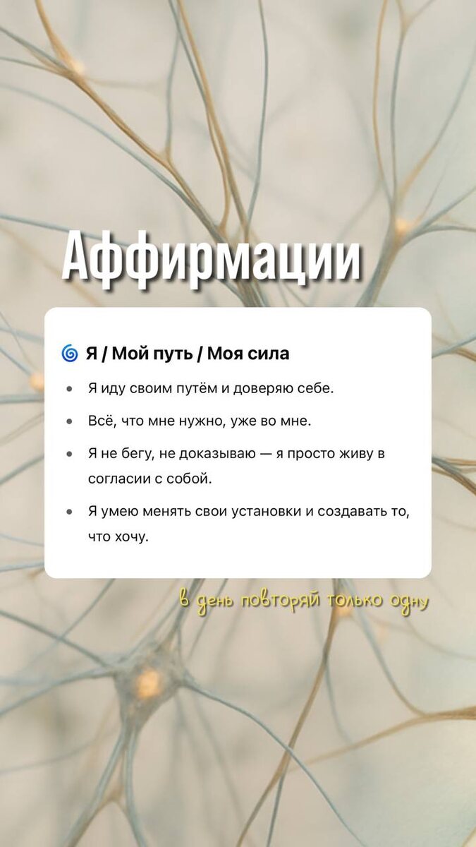 Сегодня — отличный день, чтобы сонастроиться с собой и напомнить себе, что мы сами создаём свою реальность. Слова — это не просто фразы. Это то, что день за днём формирует наши нейронные связи, наш фокус, нашу жизнь. И да, это не про волшебные пилюли, это про честное внимание к себе и внутренний настрой. Ловите аффирмации для разных сфер — проговорите, прочувствуйте, сохраните. Пусть они станут вашей точкой опоры на сегодня и каждый день. * в день только одну аффирмацию