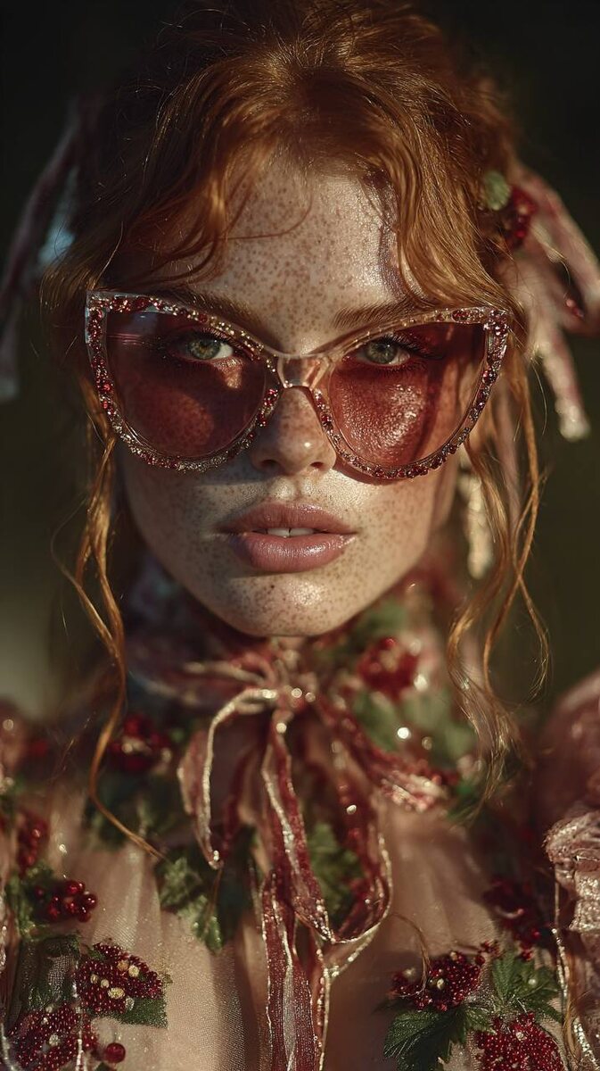 A luminous forest goddess stands beneath a lush green canopy at golden hour, wearing high-fashion strawberry-inspired sunglasses. The lenses are soft ruby red with a translucent berry sheen, like sunlit strawberry juice caught in glass. The elegant frame is crafted from frosted resin, embedded with tiny strawberry seeds and delicate pressed leaves. Her glowing skin is kissed by dappled sunlight filtering through strawberry leaves. Her long, wavy ginger-red hair is tied back with a silk ribbon the color of fresh strawberry pulp. She wears a botanical couture outfit made from layered strawberry leaves, fine sheer fabrics, and embroidered red berry accents — flowing, stylish, and natural. Dewdrops glisten on her skin and soft forest breeze moves strands of her hair. In the background: blurred bursts of bright green leaves, soft red berries, and warm golden light — an enchanted forest meets summer editorial fashion. --ar 9:16 --exp 10 --stylize 300 --v 7 👇 https://t.me/syntxaibot?start=