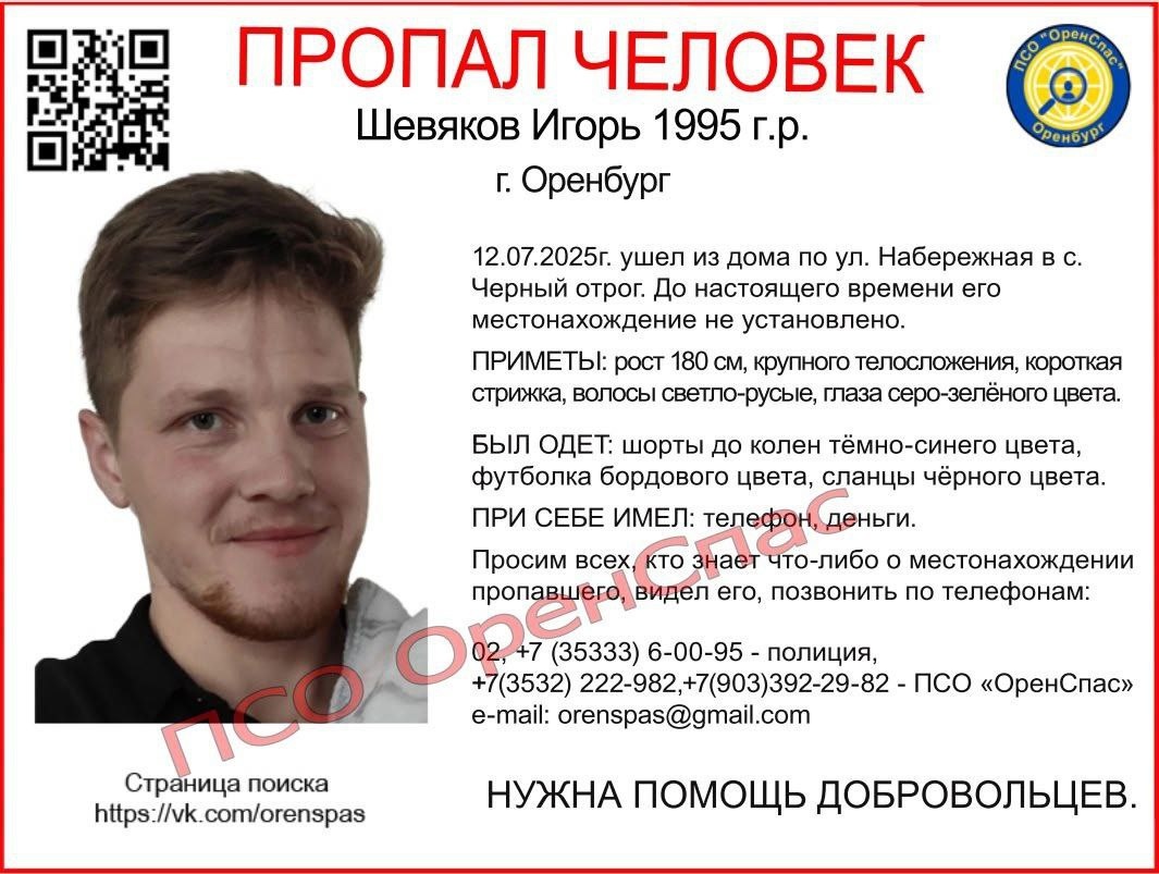 В Оренбуржье разыскивают Игоря Шевякова В Оренбургской области сотрудники полиции и волонтёры ПСО «ОренСпас» устанавливают местонахождение жителя Оренбурга. Игорь Шевяков 1995 года рождения 12.07.2025 года ушёл из дома по улице Набережной в селе Черный отрог и пропал. До настоящего времени его местонахождение не известно.