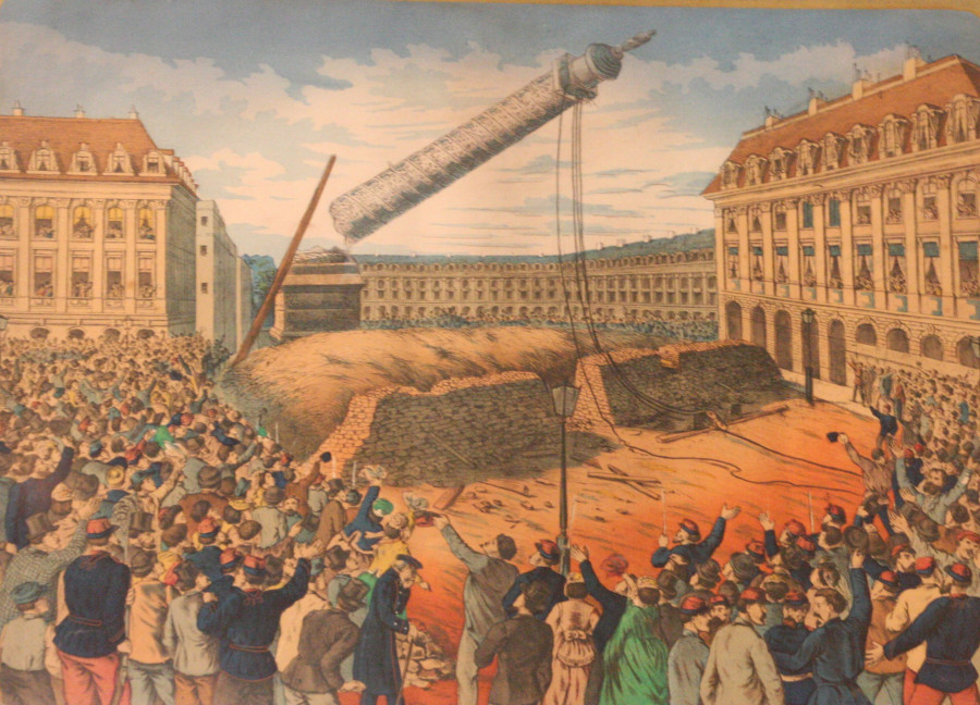 Однако этот помпезный памятник войне и смерти не нравился множеству парижан. Художник Гюстав Курбе в 1870 г. назвал ее «ручьем крови в цветущем саду» и призвал снести. Когда под влиянием катастрофического поражения Франции в войне с Пруссией к власти в Париже пришла Парижская Коммуна – правительство революционеров-радикалов, мечтателей-социалистов и рабочего люда с парижских окраин, приговор Курбе был приведен в исполнение. 12 мая 1871 г. Коммуна издала декрет: «…считая, что императорская колонна на Вандомской площади является памятником варварству, символом грубой силы и ложной славы, утверждением милитаризма, отрицанием международного права, постоянным оскорблением побежденных со стороны победителей, непрерывным покушением на один из трех великих принципов Французской республики - Братство, постановляем: …колонна на Вандомской площади будет разрушена». Месяцем позже толпа революционеров свергла колонну с постамента и разбила статую Наполеона.