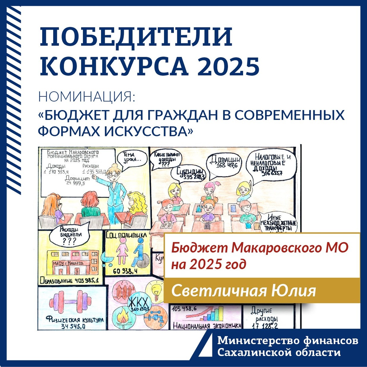 ⚡️Подведены итоги областного конкурса проектов по представлению бюджетов и открытых финансовых данных для граждан. В этом году на конкурс поступило 14 работ от физических и юридических лиц в шести номинациях. Конкурсная комиссия оценивала достоверность и полноту представленной о бюджете информации, оригинальность подачи материала и практическую значимость работы. Решением жюри победители и призерами конкурса стали 11 участников в 6 номинациях. Победителей наградят дипломами министерства финансов Сахалинской области, участников - сертификатами. Кроме того, авторам отдельных конкурсных работ даны рекомендации доработать проекты с учетом предложений членов жюри, после чего они будут направлены для участия в федеральном конкурсе проектов по представлению бюджета для граждан, проводимом Минфином России совместно с Финансовым университетом при Правительстве РФ. Познакомиться с работами участников можно по ссылке - https://sakhminfin.ru/index.php/news/4594-03062025-1.