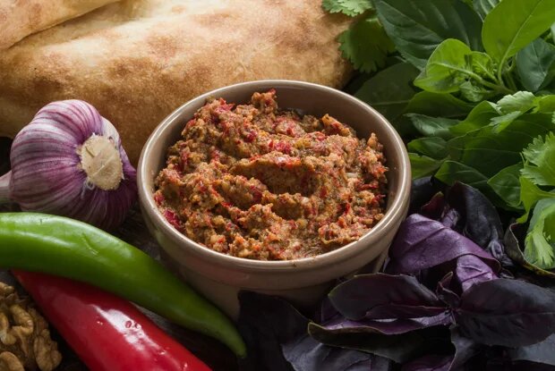 «Аджика» в переводе означает «соль», соли в составе действительно много, и часто аджика используется как базовая специя, ее добавляют вместо соли и перца. По поверью аджику придумали пастухи, которые брали ее на пастбища, чтобы сдабривать пищу. Сложно найти блюдо, где аджика не нашла бы своего применения: ее обмазывают куски мяса или птицы перед жаркой, в ней маринуют шашлык, выставляют на стол к мясным и рыбным закускам. Острый перец способствует быстрому перевариванию пищи, и это важное его свойство помогает справиться с многочасовым грузинским изобильным застольем. Важный момент: в грузинскую аджику в обязательном порядке добавляются грецкие орехи, а вот помидоры в нее не кладут. Соль 300 г Чеснок 400 г Грецкие орехи 300 г Хмели-сунели 20 г Молотый кориандр 30 г Красный перец чили 1 кг Чабер 30 г 1.Перец разрезать вдоль пополам, счистить семена, удалить хвостики. Делать это лучше в перчатках — перец отчаянно жжется. 2.Орехи подсушить на сухой сковороде. 3.Прокрутить перцы через мя