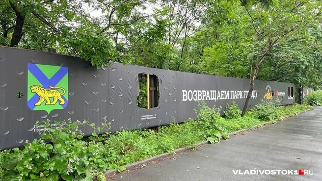 Кто-то вырезал герб Владивостока на баннере около парка Минного городка сразу в нескольких местах