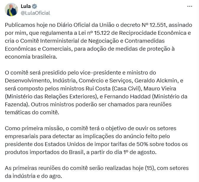 Президент Бразилии Луис Инасиу Лула да Силва издал указ, позволяющий приостановить концессии американским предпринимателям в случае ввода Соединенными Штатами пошлин на бразильские товары в размере 50% с 1 августа. Как сообщил Лула да Силва в Х, указ также предполагает создание особого комитета для выработки ответных мер на пошлины США. "В качестве первой задачи комитет выслушает предпринимателей, чтобы определить последствия объявления президентом США тарифов в размере 50% на все товары, импортируемые из Бразилии", - написал Лула да Силва. 👊 НАСОНОВ 🔴