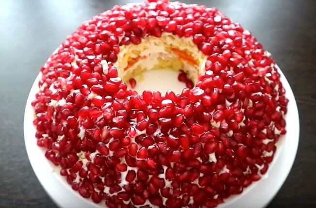 8. Вытащите зерна из граната и покройте ими весь салат со всех сторон. Осталось только убрать стакан и украсить зернышками внутренность «Браслета», предварительно также обмазав майонезом. Получилась вот такая красота!