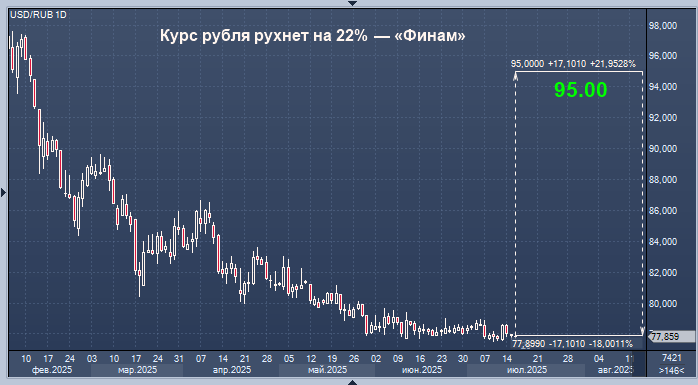 Курс рубля рухнет на 22% — «Финам» Курс доллара к рублю расчётный, фьючерс, вечный фьючерс и межбанк. Курс евро к рублю расчётный, фьючерс, вечный фьючерс и межбанк. Курс юаня к рублю биржевой, фьючерс, вечный фьючерс и межбанк. Курс валютной пары доллар/рубль, вероятно, останется в узком диапазоне 77,5-80 руб./$1 в ближайшие дни, к концу 2025 года доллар может восстановиться до уровня 95 руб./$1, полагает аналитик "Финама" Александр Потавин. "Cитуация на валютном рынке до конца текущего года в основном будет определяться темпами снижения ключевой ставки ЦБ РФ, внешними антироссийскими санкциями (особенно от США) и динамикой цен на нефть. Мы полагаем, что к концу 2025 года курс доллара может восстановиться до 95 руб./$1. Но в части покупки валюты в расчете на ее рост надо подождать подходящего момента, - пишет эксперт в материале инвестиционной компании. - Например, в прошлом году усиление курса рубля происходило с февраля по август, а потом рубль стал почти непрерывно слабеть. В авгус