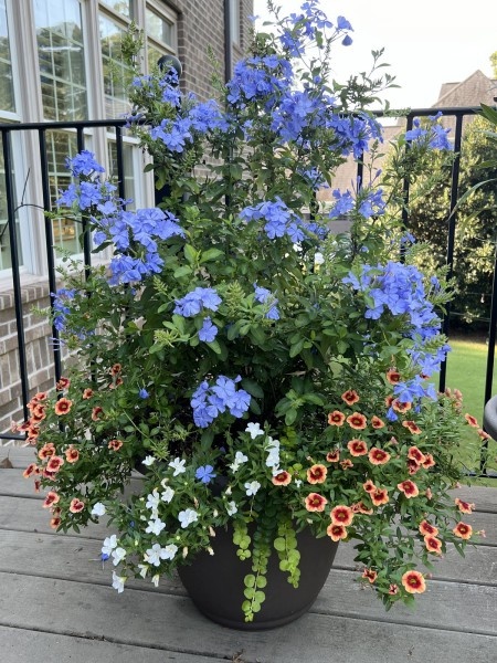 Этот ярко-голубой фонтан - не садовое растение, а комнатное. Свинчатка, она же плюмбаго. Свинчатка - типичное кадочное растение. Идеальный режим для него: летом - на улице, зимой - в зимнем саду, оранжерее, на теплой лоджии. Хотя некоторые любители держат плюмбаго и в комнатных условиях.