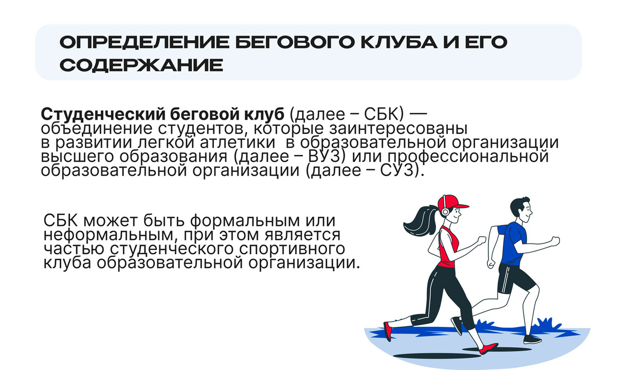 Наконец-то готовы рекомендации для студентов по созданию студенческих беговых клубов и организации их деятельности. Для исследования текущей ситуации с беговыми сообществами в ВУЗах мы решили поговорить с капитанами студенческих беговых клубов Москвы и собрать необходимую информацию. Через личные встречи и беседы мы хотели проникнуть глубже в суть проблемы, расширить список вопросов и задать дополнительные при необходимости. С 5 по 14 июня команда СЛЛА провела 13 глубинных интервью с представителями таких образовательных организаций как: Собрав все выводы и личный опыт каждого участника, мы приступили к составлению рекомендаций по развитию бегового движения — для организаций, где инициатива по созданию студенческих беговых клубов будет исходить в первую очередь от студентов, а не только от руководства. Документ по большей части составлялся студентами и недавними выпускниками — на основе их опыта работы с беговым движением в годы обучения, но также отдавался на экспертную оценку Президе