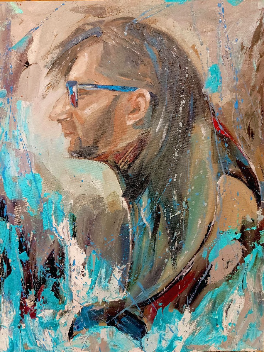 «Игорь – человек-дельфин» – это портрет, получеловек-полудельфин с лицом "я не выспался, но мне норм". Ярко-синие тона, как будто его только что вытащили из аквапарка в 3 часа ночи, верхняя половина ещё не поняла – то ли плыть, то ли идти в бар, а нижняя – дельфин, забыла, как плавать. Идеально для интерьера между бассейном и мини-баром. 🍹