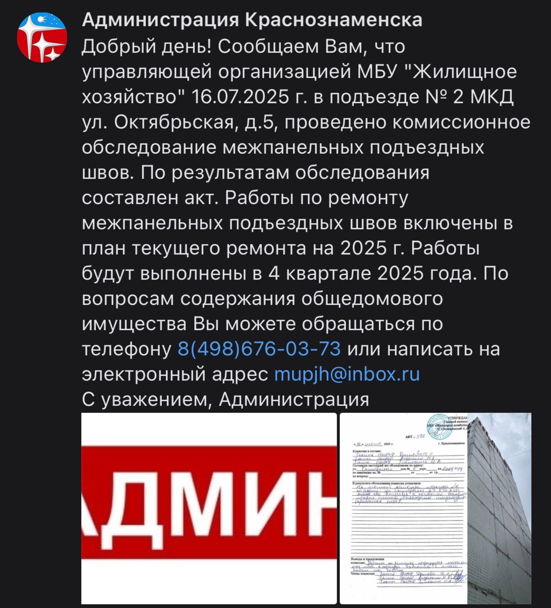 Проверка швов в подъезде №2 (ул. Октябрьская, д. 5). Планы ремонта После нашей публикации 16 июля жалобы жителей д. 5, под. 2 на ул. Октябрьской, Администрация провела проверку межпанельных швов Ремонтные работы запланированы на 4-й квартал этого года (октябрь-декабрь).