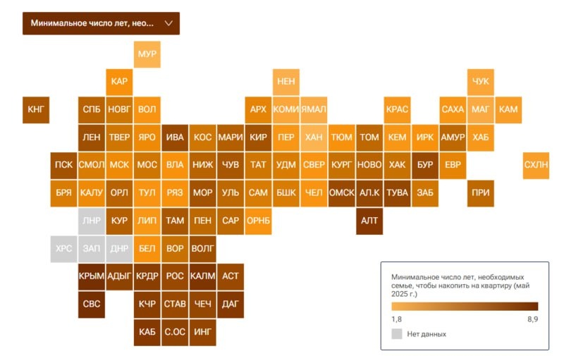 В Воронежской (43-е место) на квартиру за 5,6 млн рублей копить придётся почти 4 года, в Курской (56-е место) — 4 года (5,9 млн рублей), а в Тамбовской — 4,1 года (4,7 млн рублей).