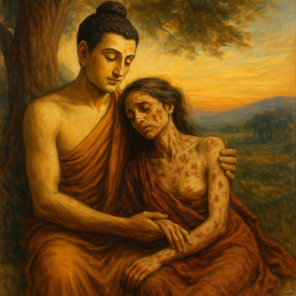 Будда и его ученики дали обет безбрачия с отказом от плотской любви к противоположному полу. Однажды, когда Будда и ученики отдыхали от зноя в тенистой прохладе деревьев, одна куртизанка, привлеченная пылающим телом и лицом Мастера, подошла к нему. Как только, она увидела божественное лицо Будды, сияющее небесной красотой, она влюбилась в него и, в любовном экстазе, с распростертыми объятиями подбежала к Будде, чтобы обнять и поцеловать его, громко воскликнув:"О, Прекрасный, Сияющий, я люблю Тебя!" Неженатые ученики были ошеломлены, услышав, что Будда говорит куртизанке! - "Любимая, и я тебя люблю, но не дотрагивайся до меня ещё сейчас". Куртизанка ответила:"Вы меня называете любимой, и я люблю вас, почему же вы упрекаете меня, что я дотрагиваюсь до вас? "Великий Мастер ответил:"Любимая я ещё раз тебе повторяю, что я дотронусь до тебя позже, но не теперь. Я хочу проверить свою настоящую любовь к тебе! "Ученики были очень сильно потрясены и некоторые из них подумали, что Мастер влюбился в куртизанку. Несколько лет спустя, когда Будда медитировал со своими учениками, он внезапно воскликнул: "Мне надо идти, мною любимая куртизанка меня зовет, теперь, я действительно ей нужен и я должен сдержать данное ей обещание" Ученики бежали за своим Мастером с тайной надеждой о спасении его от соблазнительницы куртизанки. Будда со своими учениками прибыл к тому дереву, где они встретили куртизанку, и что вы думаете они увидели? Там находилась куртизанка со своим прекрасным телом, покрытым дырами от оспенных струпьев и зловонными ранами. Ученики низко поклонились и стали поодаль от неё, а мастер взял её изможденное тело на руки и прошептал ей на ухо: "Любимая, вот я и пришёл, чтобы проверить свою любовь к тебе и исполнить своё обещание дотронутся до тебя… Я долго ждал, чтобы доказать свою подлинную, настоящую любовь, ибо я люблю тебя, когда всякий прекратил любить тебя. Я дотрагиваюсь до тебя, когда все твои лучшие друзья больше не желают дотрагиваться до тебя" Говоря так Будда вылечил куртизанку и пригласил её присоединиться к семье своих учеников. Личная любовь ограничена, эгоистична и обычно обращена на удобства и комфорт за счет другого. Божественная Любовь самоотверженна и ищет счастья для объекта любви: она беспредельна.