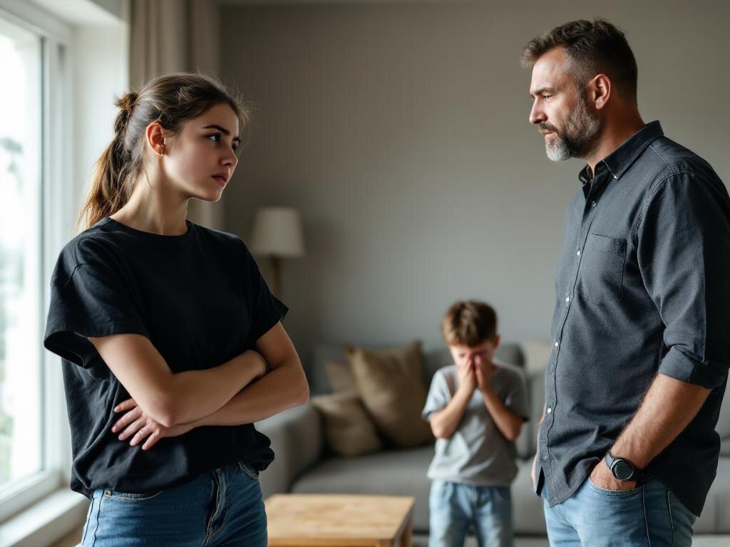 Аня выбежала из квартиры, хлопнув дверью. Звук эхом отозвался в гробовой тишине гостиной. Ольга бессильно опустилась на стул, закрыв лицо руками. Сергей подошел к окну, глядя, как фигурка дочери быстро удаляется. Миша тихо подошел к матери и прижался к ней.