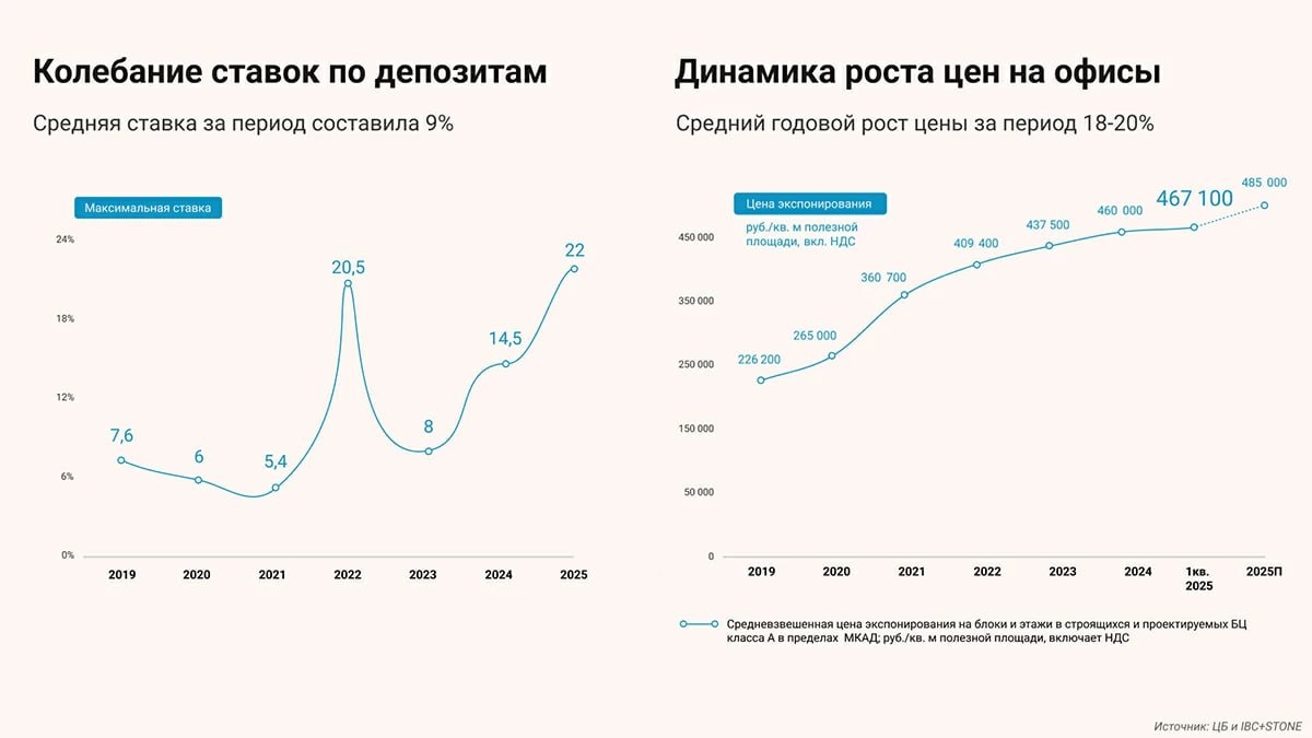 🔥 Офисы побеждают депозиты в борьбе за инвестора? ⚖️ В Ведомостях решили их сравнить... 🏢 Офисная недвижимость вернула себе лидерство в структуре инвестиций — общий объем вложений в сегмент достиг ₽108 млрд за первое полугодие 2025 года, что в полтора раза превышает показатель аналогичного периода прошлого года. Средневзвешенная цена предложения в бизнес-центрах класса А выросла с ₽226,2 тыс. за м2 в 2019 году до ₽467,1 тыс. к концу первого полугодия 2025 года. 💰 При этом депозиты с учетом реинвестирования процентов принесли за пять лет до 65%, тогда как стоимость небольших и средних офисов в бизнес-центрах класса А в Москве за этот период увеличилась примерно на 110%. Средняя ставка по годовым депозитам в топ-20 российских банков держится на уровне 18-20%, но доходность офисной недвижимости в долгосрочной перспективе оказывается выше. 📈 Вакантность в строящихся объектах, ввод которых запланирован на 2025-2027 годы, составляет около 30%, при этом лишь 11% доступны для аренды ил